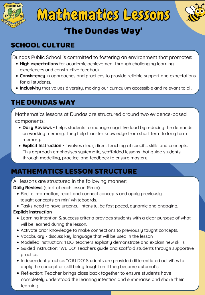 English and mathematics are taught explicitly at Dundas Public School. Explicit teaching has been identified since 2015 in the Centre for Education Statistics and Evaluation (CESE) publication What Works Best: Evidence-based practices to help improve NSW student performance.